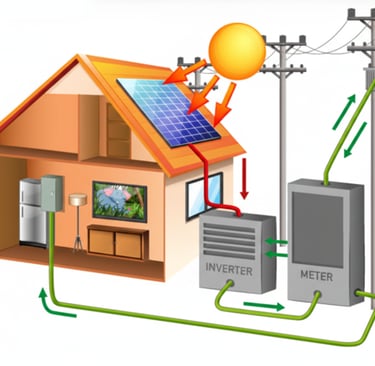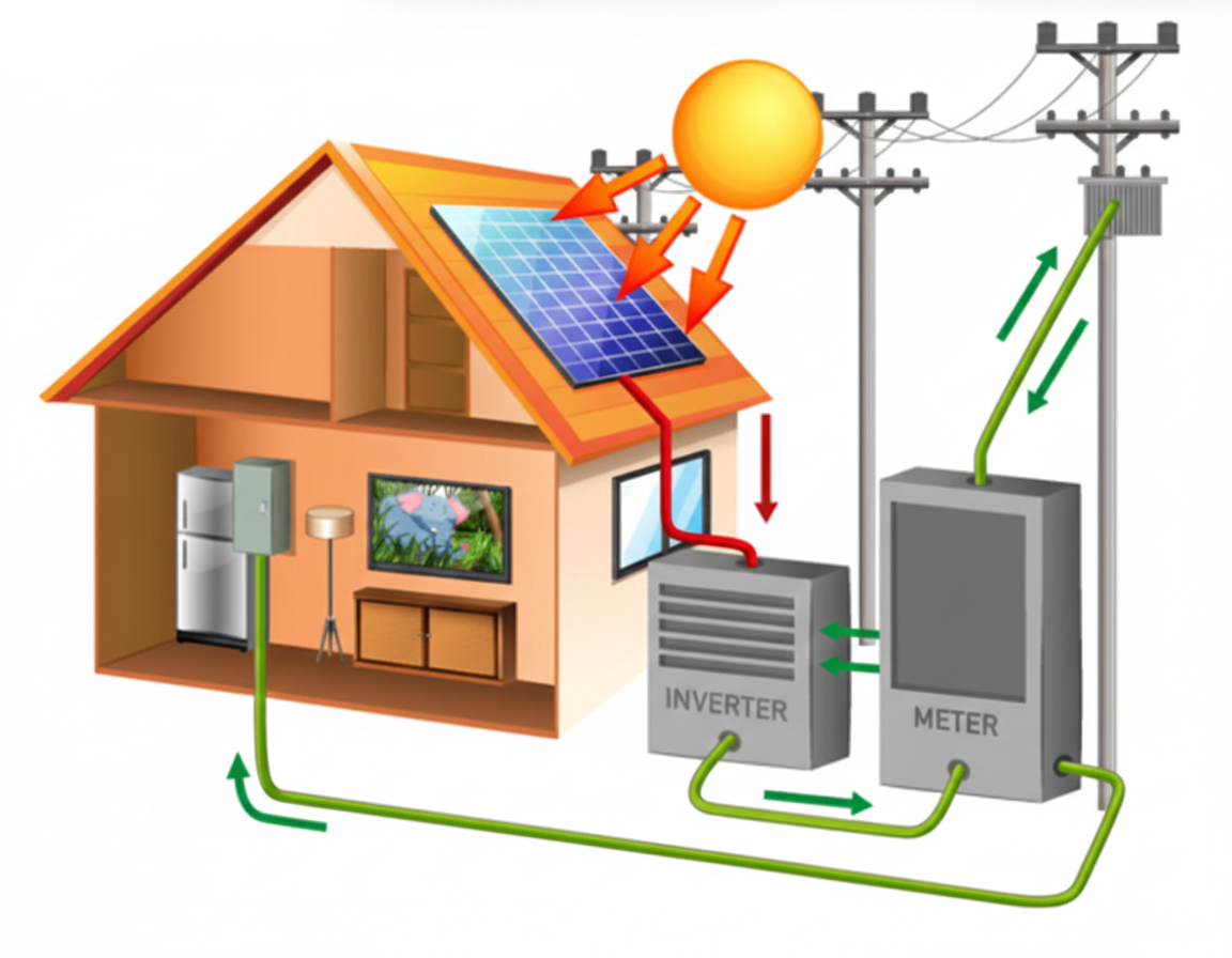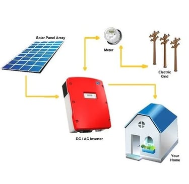 In Grid Connected Rooftop or small SPV system, the DC power generated from SPV panel is converted to AC power using power conditioning unit and is fed to the grid either of 33 kV/11 kV three phase lines or of 440/220 Volt three/single phase line depending on the capacity of the system installed at institution/commercial establishment or residential complex and the regulatory framework specified for respective States. These systems generate power during the day time which is utilized fully by powering captive loads and feed excess power to the grid as long as grid is available. In case, where solar power is not sufficient due to cloud cover etc., the captive loads are served by drawing power from the grid.